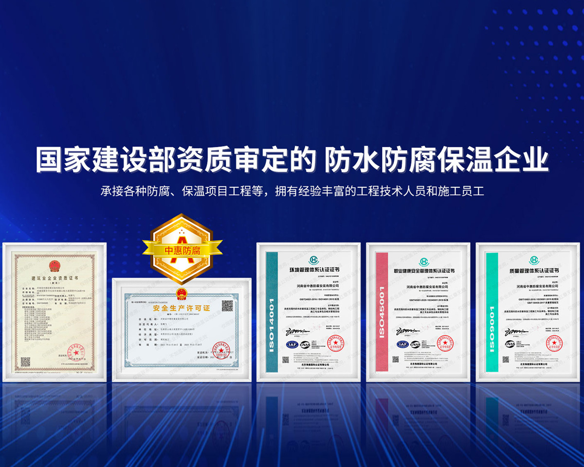 公司經營范圍:防水防腐保溫工程;消防設施工程;建筑裝修裝飾工程;建筑機電安裝工程;電力工程;建筑工程;石油化工工程;工業清洗工程;油罐清洗工程;鋼結構工程;環保工程;模板腳手架工程;電纜防火封堵、防污閃噴涂、外墻外保溫工程;各類施工勞務作業;設備維修、船舶鉚焊、涂裝;電力工程材料、建材、防水材料、防火材料、防腐保溫材料銷售,并相繼通過了GB/T19001-2008idtISO9001:2008GB/T50430-2007質量管理體系認證證書。GB/T24001-2004idtISO14001:2004環境管理體系認證證書。GB/T28001-2011idtOHSAS18001:2007職業健康安全管理體系認證證書。公司是中國防腐蝕于防護協會、中國施工企業管理協會、電力協會和中國鋼結構防水協會會員單位。 公司的經營業務涵蓋了石油、化工、電力、冶金、煤炭、船舶、國防、燃氣、水利、環保、交通運輸、航空及國防軍工和輕紡市政等行業的防腐保溫絕熱設備。鋼結構安裝、防火、防水、金屬噴鍍、聚脲噴繪、陰極保護、防滲透堵漏、玻璃鋼及各種磚版材料襯里、橡膠襯里、煙氣硫和耐酸溶劑腐蝕等工程施工。公司連續十年榮獲“省市先進施工企業”“安全生產先進單位”“重合同,守信用企業”和“AA***資質企業”的稱號。2000年被命名為市級文明單位,2002年被國家工商行政管理局命名為“重合同,守信用的企業”、被中國工業防腐蝕技術協會命名為“防腐蝕企業,能源節約及環境保護領域有豐富的經驗和***的業績。工程一次交驗合格率100%。其中攀枝花鋼鐵公司煉鐵廠四號高爐及熱風爐防腐工程、上海寶鋼公司煤氣柜防腐工程、撫順石油一廠裝置防腐項目、齊魯石化公司稀烴廠高塔防腐工程、吉林化學工業公司煉油廠油罐防腐工程、天津石化熱電廠六號爐頂棚聯絡管保溫工程、大慶油田(太倉)力神泵業工程、中國化學工程第十一建設工程、中原油田勘探局工程、中國石化銷售有限公司華北分部、魯皖輸油管道工程、貴州開磷息烽合成氨工程、陜西黃陵煤化工程、中國石油天然氣西部管道塔里木輸油工程、邯鋼集團邯寶鋼鐵公司煉鐵工程、德州供電工程、吉寶(南通)船廠工程,偃師華潤熱力工程、鄭州熱力總公司。 河南省中惠防腐安裝有限公司愿以豐富的施工經驗,***的技術,***的設備,***的管理,***的服務,竭誠為國內外廣大的用戶提供***滿意、******的工程作品。 我公司愿與國內外同仁一道,團結協作,共同推進防腐蝕行業發展! 公司地址:河南省長垣縣建設路北段360號 固定電話:0373-8866488 郵編:453400 網址:http://www_zhff_com_cn.tuopanhome.com